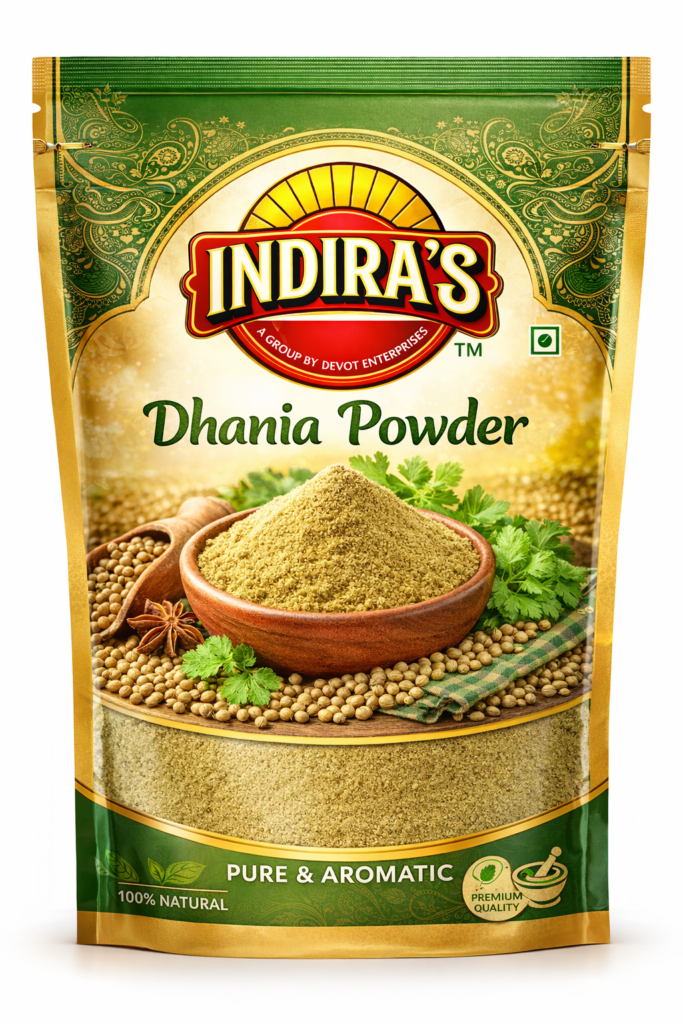 Indiras Dhania Powder is prepared from carefully selected premium coriander seeds, gently cleaned and finely ground to retain their natural freshness, mild sweetness, and warm aroma. This essential spice adds depth, balance, and a smooth flavour to everyday Indian cooking.