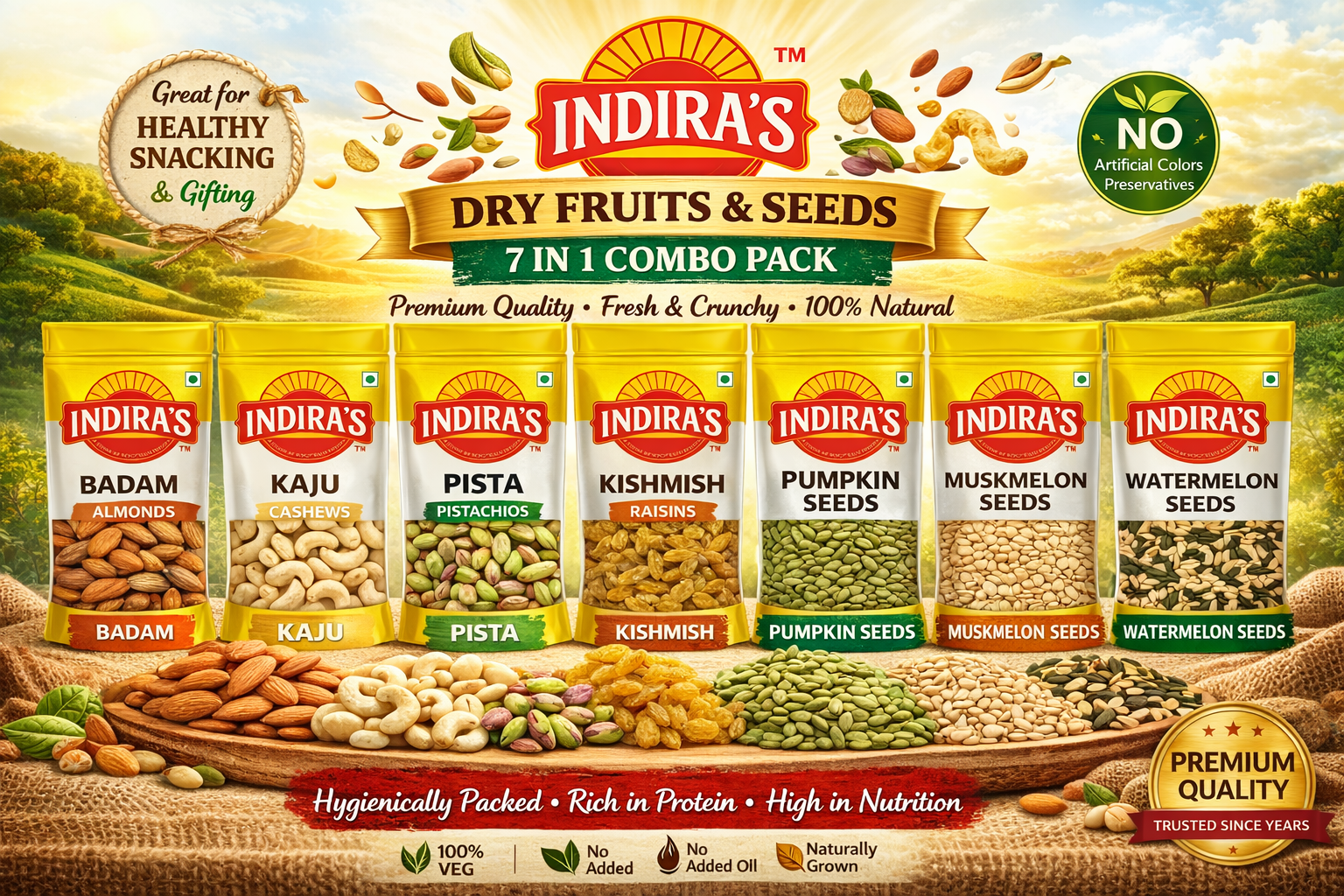 Indulge in the goodness of nature with Indira’s Dry Fruits and Seeds Combo — because healthy living starts with the right choice!