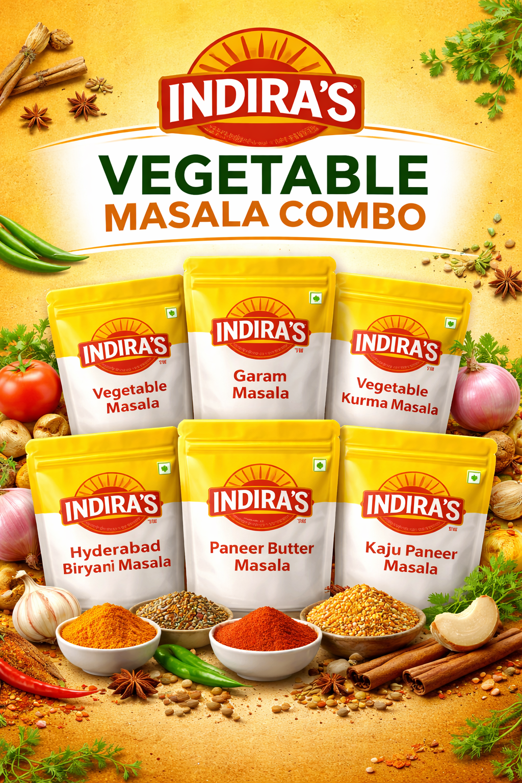 INDIRAS VEG MASALA COMBO CONSIST OF VEGETABLE MASALA , GARAM MASALA ,VEGETABLE KURMA MASALA , HYDERABAD BIRYANI MASALA , PANNER BUTTER MASALA , KAJU PANNER MASALA .